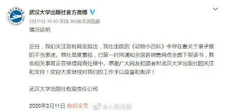面对质疑,2月11日下午,武汉大学出版社回应称:其出版的《动物小百科》已第一时间通知全国各销售网点全面下架,其他相关事宜正在继续调查处理中。
