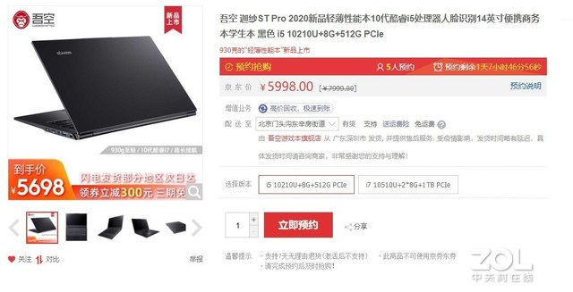 标准版【i5 10210U+8G+512G PCIe】预约抢购+立减价为5698元(点击查看详情);