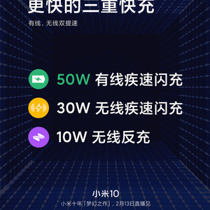 【手机中国新闻】2月12日,小米官方账号公布了即将发布的小米10手机充电规格。这款新机最高支持50W功率的有线充电,支持30W功率无线充电,并支持最高10W功率向其他手机进行反向充电。