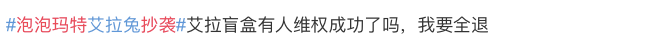 目前#泡泡玛特艾拉兔抄袭#话题阅读量已经达到623.5万。随着社交平台上的维权退货浪潮愈演愈烈,泡泡玛特的品牌声誉势必受到影响。