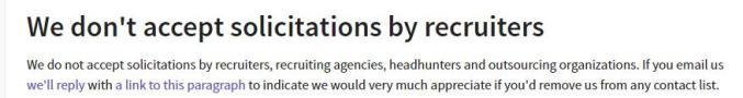 Gitlab 还在员工手册中明确了他们要什么样的员工,并且拒绝招聘外包公司和猎头公司。如果有外包公司或猎头发邮件给 Gitlab,他们会直接回复下面这段和原文链接,并欢迎对方把 Gitlab 拉黑。