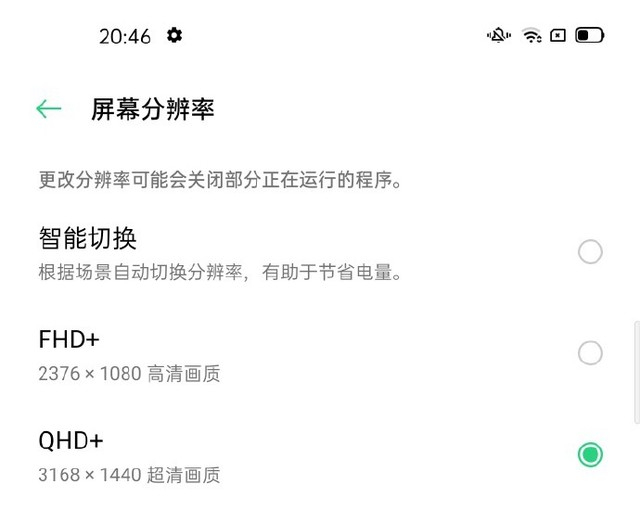 根据曝光的截屏分析,OPPO Find X2将会搭载3168x1440分辨率的QHD+屏幕,并支持QHD+和FHD+两种分辨率显示进行切换,同时也支持智能切换。