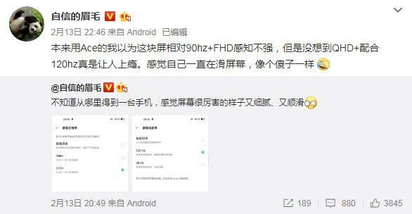2月13日,OPPO沈义人在个人微博上再次曝光了疑似OPPO Find X2的屏幕和刷新率设置截屏,并称“QHD+配合120hz真是让人上瘾”。
