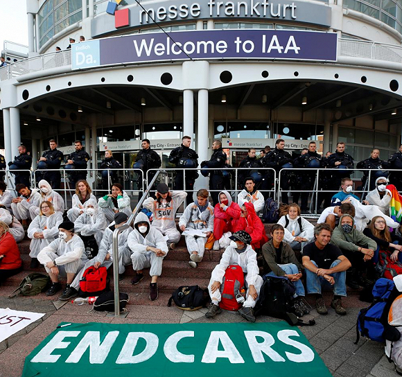2019年9月15日,法兰克福车展展厅门口的抗议者。图源:世界报