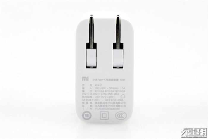充电器背后是产品的铭牌参数部分,全名:小米Type-C电源适配器 65W、型号:AD651、输入:100-240V ~50/60Hz 1.5A、输出:5V3A / 9V3A / 12V3A / 15V3A / 20V3.25A 65W MAX、制造商:南京酷科电子科技有限公司、监制:江苏紫米电子技术有限公司、S/N:FCAD6512003000051。
