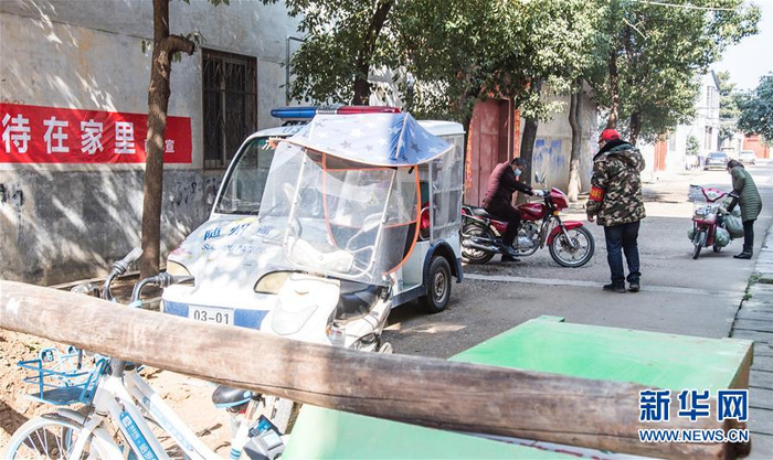 2月9日,在随州市曾都区柳树淌社区,工作人员劝社区居民不要外出。 截至2月8日24时,湖北省随州市新冠肺炎累计确诊病例984例。记者奔赴湖北随州疫情一线,用镜头记录下这里疫情防控情况。 新华社记者肖艺九摄