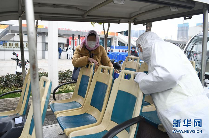 2月11日,社区工作人员将出院患者接回家。 当日,武汉市武昌方舱医院首批新冠肺炎轻症患者经过治疗出院。 新华社记者 程敏 摄