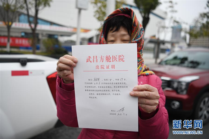 2月11日,一名出院患者展示出院证明。 当日,武汉市武昌方舱医院首批新冠肺炎轻症患者经过治疗出院。 新华社记者 程敏 摄