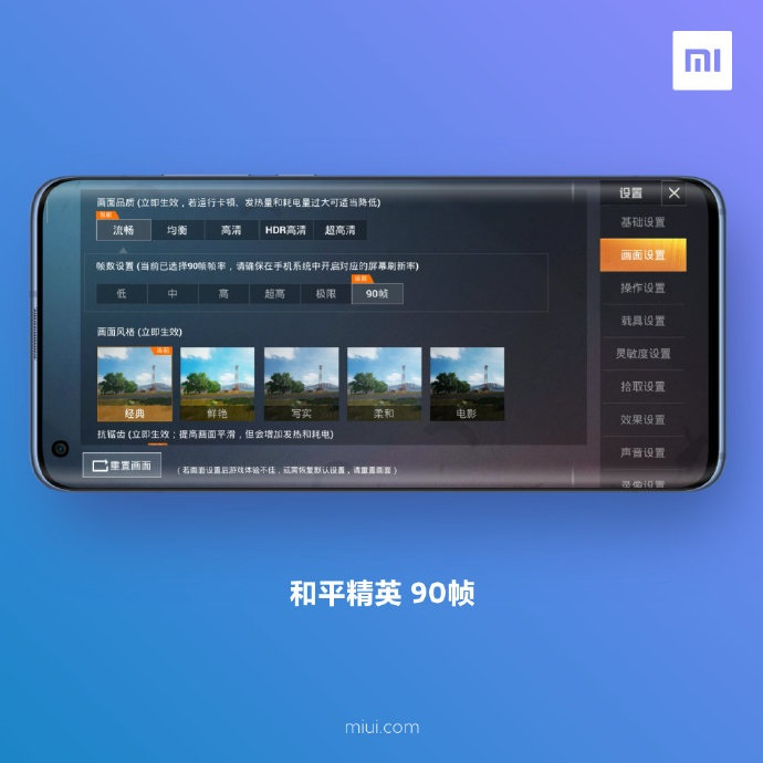 小米10采用了6.67”AMOLED小挖孔曲面屏,支持90Hz刷新率,180Hz触控采样率。现在据小米MIUI官方确认,小米10系列已经支持《和平精英》的90Hz选项。