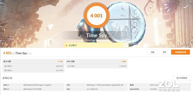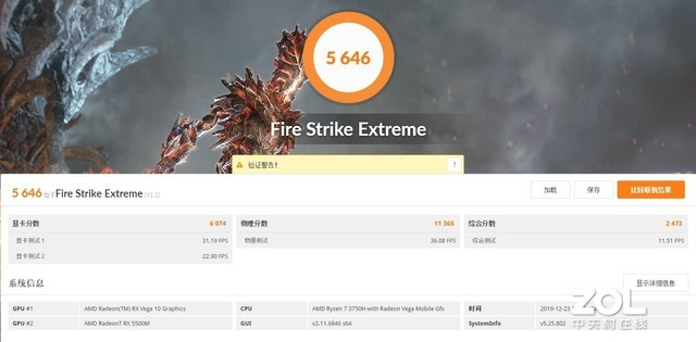 我们分别选用Time Spy和Fire Strike Extreme两种模式对其进行了测试。图形分数方面,前者得分4133分;后者得分6074分。总体性能远高于NVIDIA GeForce GTX 1650独立显卡,略低于GTX 1660Ti独立显卡,实际体验上基本与GTX 1660Ti独显持平。