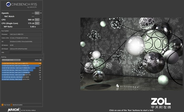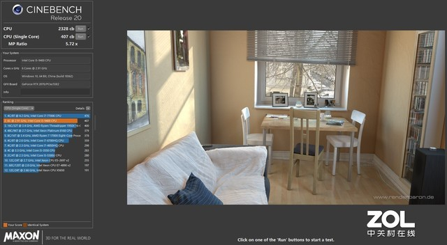 我们通过CINEBENCH R15和R20来看看其单核和多核性能表现。经过测试可以看到,前者单核得分175cb,多核得分980cb;后者单核得分407cb,多核得分2328cb。相对于大多数游戏本使用的移动级酷睿i5 9300H处理器来说,i5 9400处理器的多核性能更加出众。