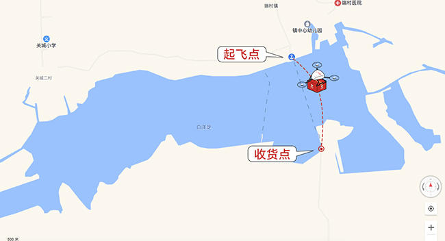 在了解到需求后,我们的工程师们就带着无人机到了白洋淀边上,用一天多时间进行了地形勘测,在摸清楚当地需求情况下,建立了一条航线,这条航线是横跨白洋淀的一条航线,距离只有两公里,单次配送过程只需要不到10分钟的时间,在完成正常订单配送的同时 ,京东物流还将村民自发捐赠的77公斤物资分5架次运送到了村里。