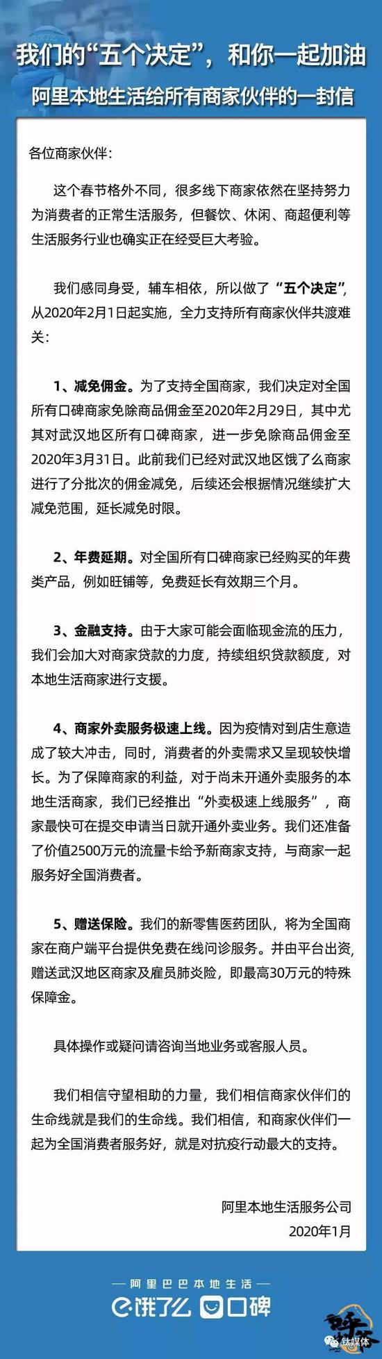 1月30日,同时掌管“饿了么”和“口碑”平台的阿里本地生活对外宣布,面向商家出台“五个决定”,包括减免佣金、年费延期、提供金融贷款等措施;2月2日,美团也相继发布了“七项商户帮扶举措”,内容大致相似。