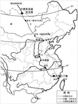 · 中俄恰克图茶叶贸易路线。到1841年(道光二十一年),中俄贸易额已达到达到1240万两白银
