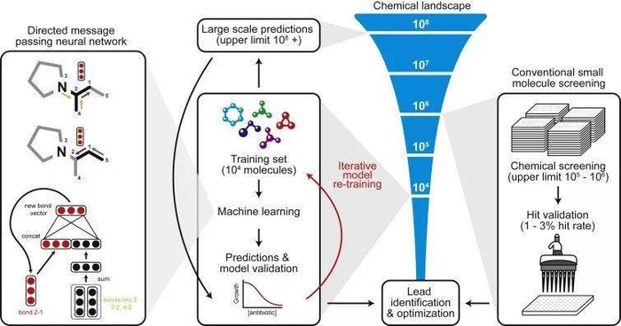 研究人员通过计算机深度学习系统建立的模型,可以在几天内筛选超过 1 亿个化合物,从而挑选出不同于现有药物杀死细菌机制的潜在抗生素。