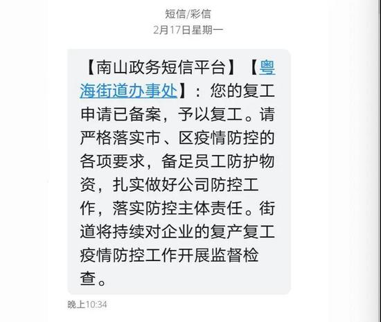 2月17日晚十点半左右,我终于收到了来自南山政务部的予以复工通知。