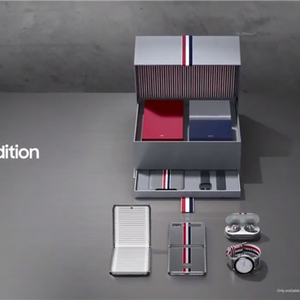 三星Galaxy Z Flip Thom Browne版是一个完整的包装。它不仅包括三星的新型折叠屏智能手机Z Flip,还包括新的Galaxy Buds无线耳机,Galaxy Watch Active 2智能手表,用于折叠屏手机的皮套,所有包装都装在这个特殊的礼品盒中。
