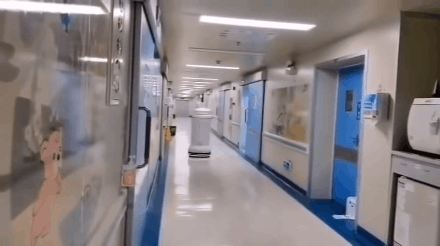 广东省人民医院引进的双胞胎机器人「平平」「安安」,负责为隔离病房配送餐食和药品: