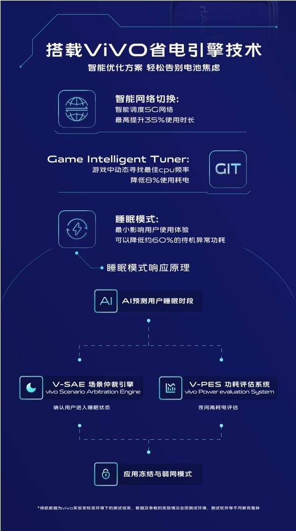 给5G手机配备大容量电池只是提升续航时长的基础,还需要拥有高效的省电优化方案,在软硬件协同下才能让手机电量更抗打。vivo Z6采用vivo省电引擎技术,智能调度5G网络,让手机续航时长进一步提升35%以上。在GIT技术的支持下,vivo Z6在游戏场景中能够寻找最佳CPU频率,降低手机使用耗电。同时,vivo省电引擎技术支持睡眠模式,能够AI预测用户睡眠时段,并进入应用冻结与弱网模式,最小影响用户的使用体验,并可降低约60%的待机异常功耗。软硬协同优化续航体验,从而造就“灭霸”级续航神器。