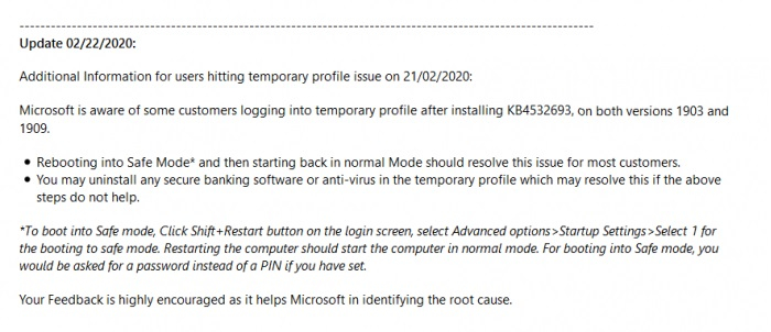 在最新的社区帖子中,微软承认了日前面向Windows 10 Version 1903和1909的累积更新错误,并提供了恢复个人资料的一种解决方案。微软称:“微软承认部分v1903和v1909用户在安装KB4532693之后登录临时配置文件的情况。”