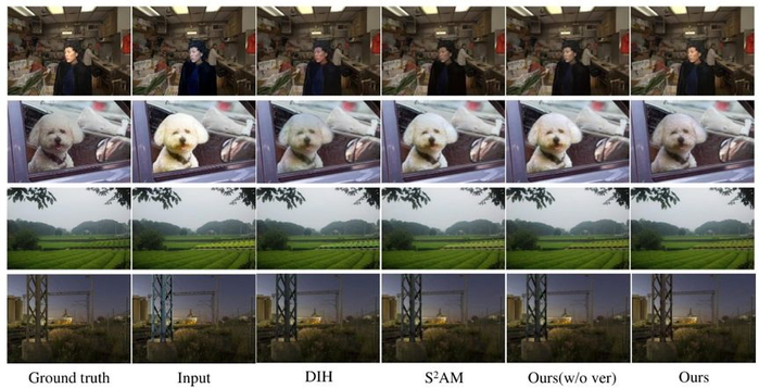 我们生成器的结构基于 UNet 实现,但是增加了类似于 [2] 中的注意力机制 (attention block)。另外,我们引入了两个鉴别器,第一个鉴别器是生成对抗网络(GAN)里面标准的鉴别器,作用于整张图片,使得生成图片的数据分布和真实图片的数据分布接近。第二个鉴别器就是我们提出的域验证鉴别器,使得生成图中前景和背景的域尽可能接近。具体来说,我们首先用部分卷积 (partial convolution) 分别提取前景和背景的域表征。部分卷积最早应用于图像填充 (image inpainting),在这里用来提取形状不规则的前景和背景的域表征,可以避免其他区域的信息泄露和默认填充方法的干扰。基于前景和背景的域表征,我们提出了域验证损失 (domain verification loss)。我们的域验证损失虽然最终包装成了对抗损失 (adversarial loss) 的形式,但本质上是基于前景和背景域表征相似度的验证损失 (verification loss)。在我们构建的数据库上,我们比较了我们的方法、传统的图像和谐化方法和基于深度学习的图像和谐化方法。实验结果表明我们的方法优于现有的方法。可视化结果的比较见下图,我们比较了之前的图像和谐化深度学习方法 DIH 和 S2AM,也比较了我们不用域验证鉴别器(domain verification discriminator)的方法。