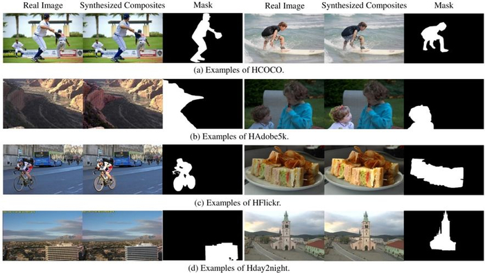 我们构建数据库的方法仿照 [1] 中的策略,具体来说,给定一张真实图,选择一个前景进行调整使其和背景不和谐,得到一张人造的合成图。这种构建数据库的方式可以产生大规模成对的训练数据用以训练深度学习模型。但是 [1] 没有公布其构建的数据库,并且 [1] 建库的方式在合成图的合理性和多样性上存在明显不足。对前景进行调整使其和背景不和谐并不困难,简单的改变前景亮度即可快速生成大量的合成图。然而,如果要保证合成图的合理性和多样性并且接近实际的应用场景,则非常困难。因此,我们构建了一个 [1] 中数据库的增广增强版本,共包含 73,146 对合成图和真实图的数据库。我们的数据库包含四个子数据库:HCOCO, HAdobe5k, HFlickr, Hday2night,其中 Hday2night 是 [1] 中没有的子数据库。Hday2night 的合成图更接近真实的合成图,因此相比较其他三个子数据库有特殊的参考价值。我们针对产生合成图的种种问题,用两轮自动筛选和逐张人工筛选保证最终保留图片的质量。我们对最终的数据库做了全面细致的分析,包括不同的前景比例、不同的前景调整方法、不同的语义种类对图像和谐化数据库以及图像和谐化算法结果的影响,详见论文的补充材料。接下来,我们从每个子数据库选两个例子展示我们的数据库。如下图所示,我们对真实图片 (real image) 的前景 (mask 对应的区域) 进行调整,得到合成图 (synthesized composite)。可以看出在合成图中,前景虽然真实,但是和背景明显违和,整张图看起来不真实。图像和谐化的任务是调整合成图的前景,使其与背景和谐。