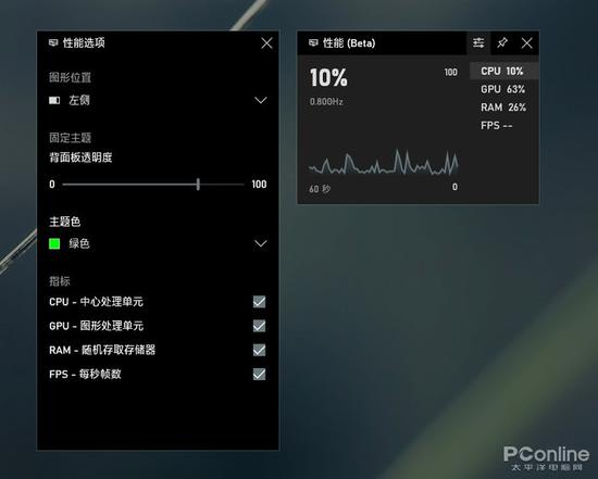 资源监视器的功能很多,比如CPU占用率、实时主频、60秒曲线、显存用量、GPU占用率、内存占比、FPS等,都可以在面板中一目了然。借助设置面板,我们可以对其进行更深层次的设置,比如主题色、背板透明度,或者哪个模块显示出来等等。拖拽顶部标题栏,你可以把它放置到桌面的任意位置,同时面板大小也能调节。
