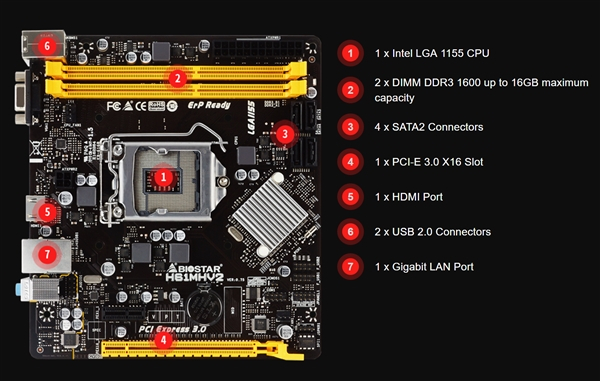 主板提供两条DDR3-1600内存插槽(最大16GB)、四个SATA 3Gbps接口、一条PCIe 3.0 x16(搭配三代酷睿i5/i7才支持)和一条PCIe 2.0 x1扩展插槽、Realtek RTL8111H千兆网卡、Realtek ALC662 5.1声道声卡,背部接口有一个PS/2、四个USB 2.0、一个HDMI、一个VGA、三个音频口。