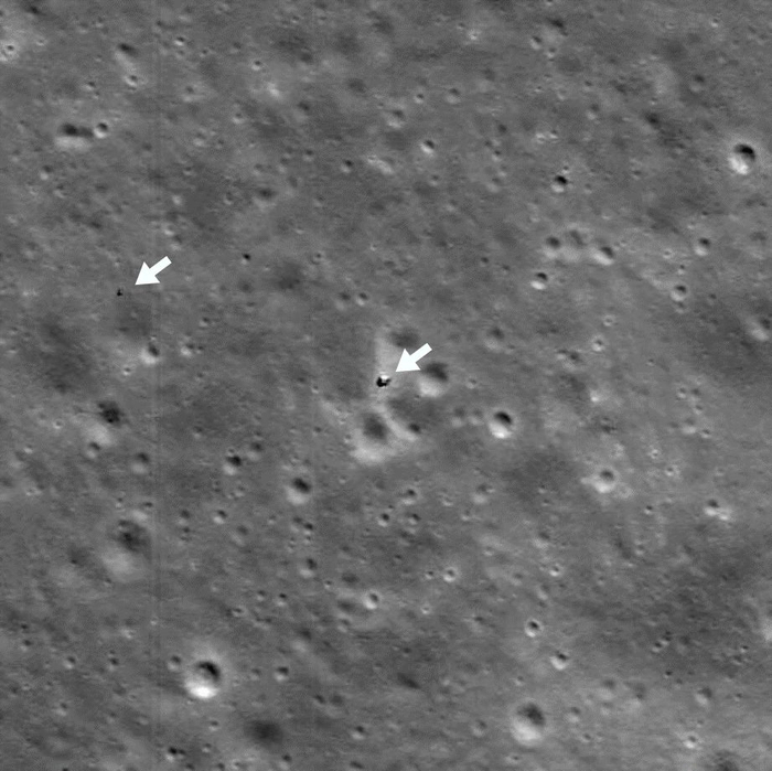 2019年7月,NASA的月球勘测轨道飞行器拍到了月球背面冯卡门陨石坑中的嫦娥四号探测器(图片中央的黑点)和玉兔二号月球车(西北方向的小黑点)(图片来源:James Stuby改自NASA)