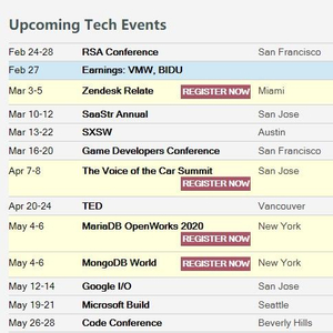 据 techmeme 网站汇总,截至 2020 年 5 月 31 日,预计举办的国际性科技会议达 11 场,包括 GDC 2020、Google I/O、微软 Build 2020 、Code Conference 大会等。