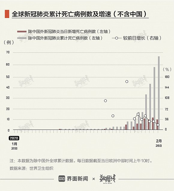 世卫组织数据还显示,近期除中国外的死亡病例数也在快速攀升。2月20日以来累计死亡数由8人上升至67人,增长了737.5%。死亡病例主要集中在伊朗(26例)、意大利(17例)、韩国(13例)和“钻石公主号”(4例)。
