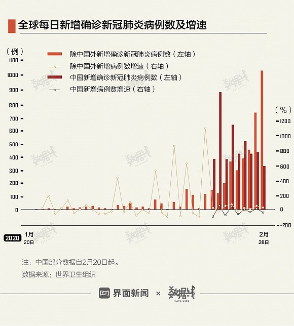 2月28日,除中国外新增确诊病例数首次破千,达1027例。12天前(2月16日),除中国外新增确诊病例数才首次破百,当日新增157例。1月21日至2月15日,仅有5天(2月5日、7日、11日、12日和14日)的新增确诊病例数超过30例。
