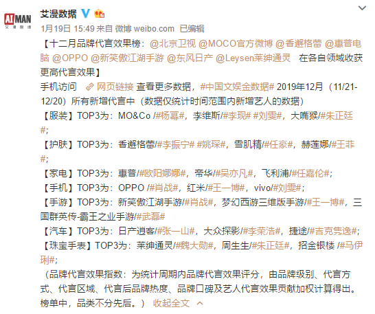 根据艾漫数据发布的2019年12月、2020年1月品牌代言效果榜,肖战推广、代言的OPPO手机、新笑傲江湖手游、开小灶等品牌,都位列同类品类TOP1。而在事件发酵后,肖战粉丝控评的重点就是各大品牌官博,真果粒官博热评第一的肖战粉丝评论道:“我非常乐意购买任何由肖战代言、推广、担当大使且记入肖战销量的产品。”