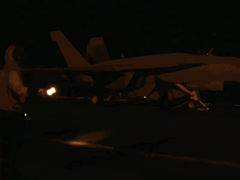 该“双航母”编队进入波斯湾后,开始不间断地进行连续昼夜起降战机演练,颇有大战在即的节奏,图为一架F/A-18E“超级大黄蜂”战机夜间从“林肯”号航母上弹射起飞动态图。
