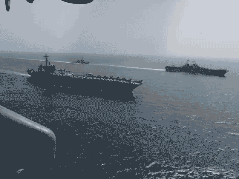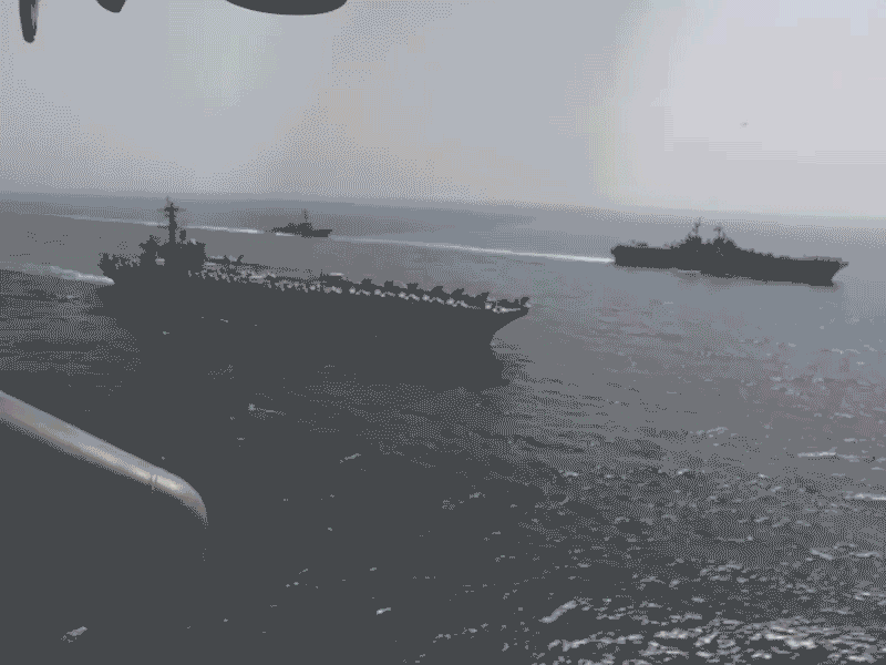 5月19日,美海军“林肯”号(CVN-72)核动力航母与“奇尔沙治”号(LHD-3)两栖攻击舰组成“双航母”编队进入波斯湾演练,威慑伊朗意味明显。图为美军直升机航拍的“双航母”编队视频截图。
