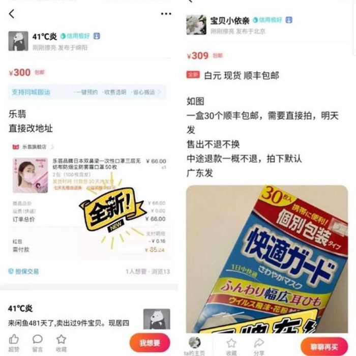 很多黄牛拍下口罩后在闲鱼售卖,目前,在闲鱼搜索“口罩”两字已经无法显示任何结果,很多用户也表示,只要在闲鱼看到高价转卖口罩就举报。