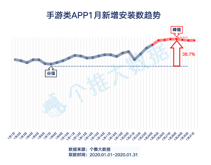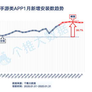 根据36氪与个推大数据合作统计,2020年春节档手游类APP新增安装数在1月大幅度提升,于1月22日之后直线上升,至1月24号除夕当天接近峰值,之后一直维持在高位。数据显示,1月底出现的手游类APP安装数峰值在不到一个月的时间里增长了38.7%,增长十分显著。