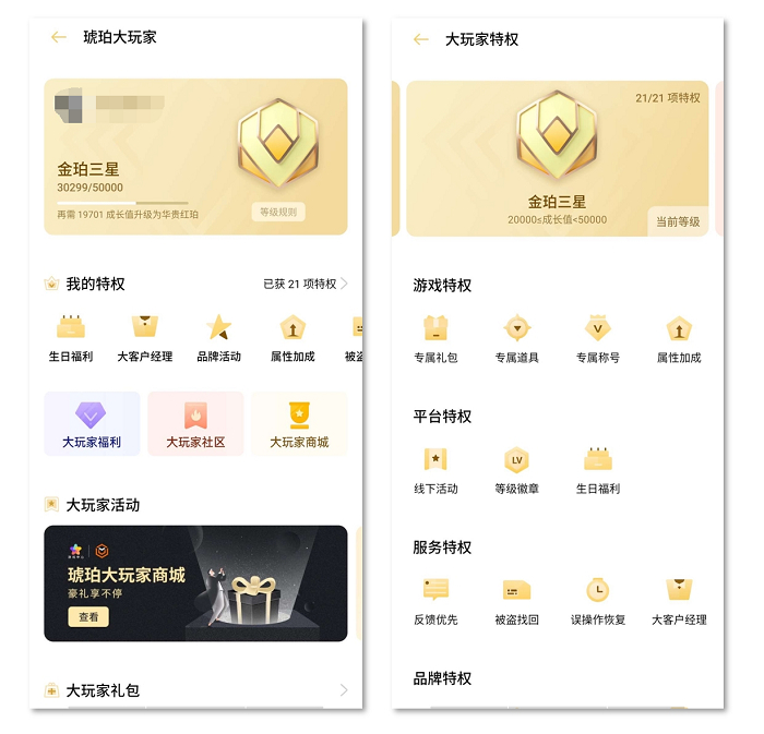 在促活方面,OPPO游戏搭建了琥珀大玩家(原琥珀会员)用户成长体系,包含游戏、平台、服务、品牌四大特权,提供了全方位的服务。
