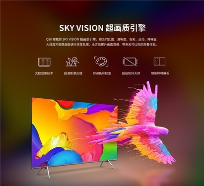 创维 55Q30搭载的SKY VISION超画质引擎,综合对比度、清晰度、色彩、运动、降噪五大维度对图像进行深度处理,全方位提升画面观感,带来无可比拟的观看体验。全时AI 2.0在全时AI基础上增加了“万物互联”功能,结合全时AI精灵将电视打造为智能控制中心,真正实现了全屋家电的互联控制。并通过语音升级,使我们的生活更加便捷有趣,让人机沟通零界限。