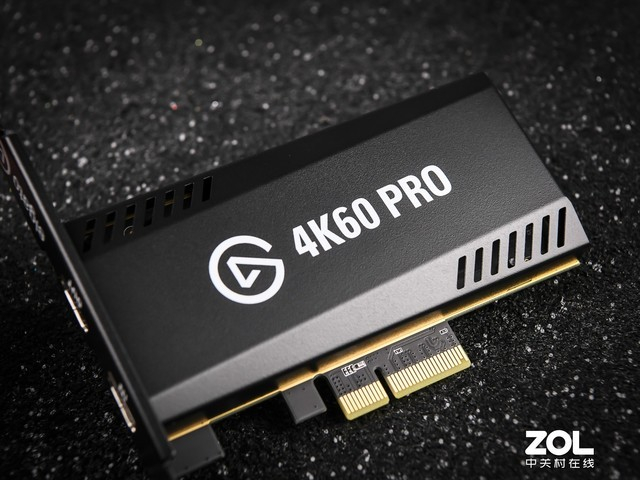 采集卡正面为简洁的黑色金属外壳,外壳做了比较好看的几何形状设计,中心印制了elgato的logo和4K60 PRO的字样,两侧还有整齐的散热开槽。