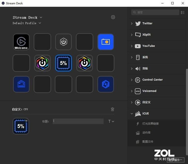 elgato 4K60 Pro MK.2还支持Stream Deck硬件。这块有着15个按钮的屏幕上可以自定义按钮功能。上图中间的四枚按钮是笔者设置的iCUE调节功能以及CPU占用显示。
