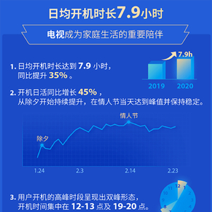 此前,勾正数据发布研究报告称,春节期间国内智能电视日活率同比上涨15.6%,日均观看时长为6.33小时。另外,据QuestMobile发布的数据,春节期间移动互联网用户日均使用时长为6.8小时,同比上涨21.4%。而本次TCL春节长假数据报告显示,2020年春节期间,TCL电视的开机日活同比提升45%,开机时长达7.9小时,同比增长35%。从数据对比来看,TCL电视开机时长超过了OTT行业平均水平和移动互联网。这意味着,在疫情影响下的春节假期,越来越多用户愿意把时间花费在电视上,智能电视行业也由此迎来了新的发展机遇。