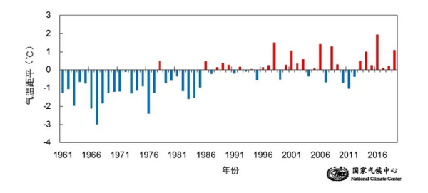 ▲全国冬季平均气温距平历年变化(1961/1962-2019/2020年)。图/国家气候中心