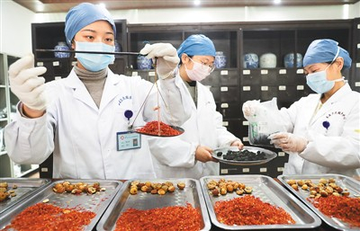 疫情发生以来,江苏省南通市南通汉药中医医院的医务人员加紧配制中药茶饮剂,预防新型冠状病毒肺炎,助力抗疫。该中药茶饮剂具有调理体质、增强免疫力等功效。图为医院的医务人员在称量中药预防茶饮剂的药材。