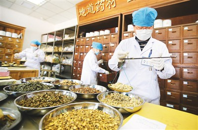 疫情发生以来,浙江省湖州市卫健委抽调中医专家通过辨证施治,为患者提供中药汤剂,发挥中医药防治作用。图为3月3日,在湖州市德清县阜溪街道社区卫生服务中心,中药师根据处方调配中药。
