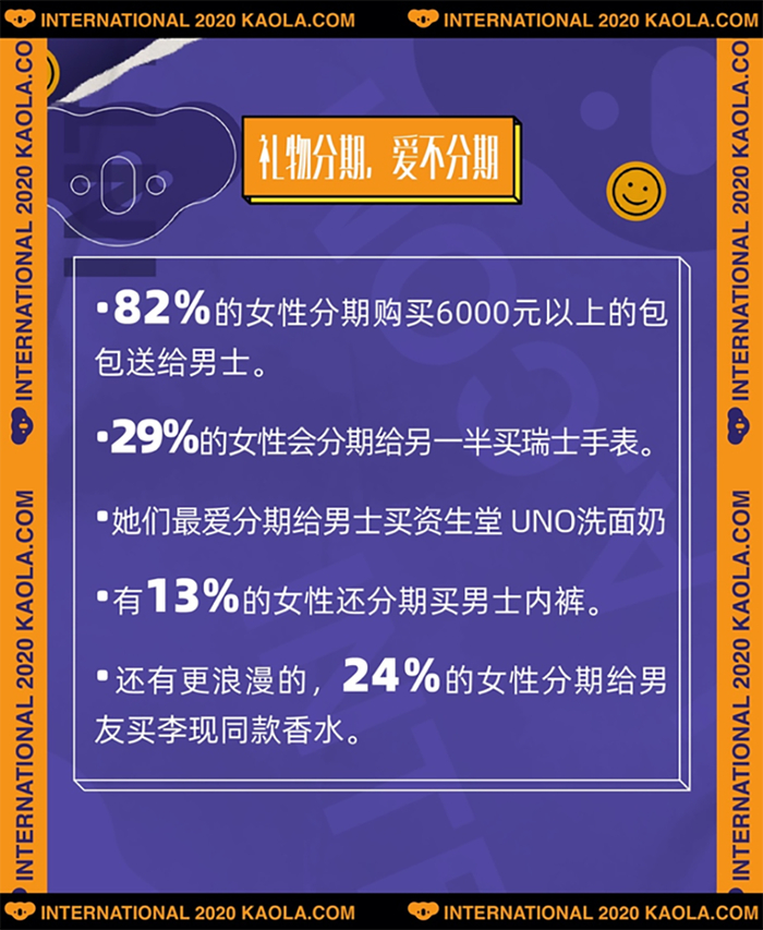 在考拉海购上,82%的女性分期购买6000元以上的包包送给男士。29%的女性会分期给另一半买瑞士手表。