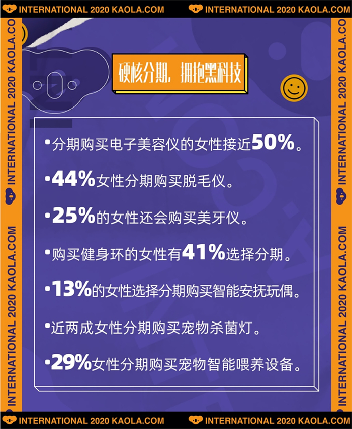 拥抱黑科技,也是女王们越来越硬核的生活方式。考拉数据显示,分期免息买电子美容仪的女性接近50%;44%女性分期买脱毛仪,还有25%的女性分期买美牙仪。
