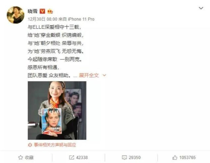 2019年的最后一天,晓雪以一句“今起随缘席散 一别两宽”道别了与ELLE长达13年的相守。配图里,她长发过肩,戴着巧克力色的绸带,不似如今气质清冷,手里拿着1988年第一期《ELLE世界时装之苑》。
