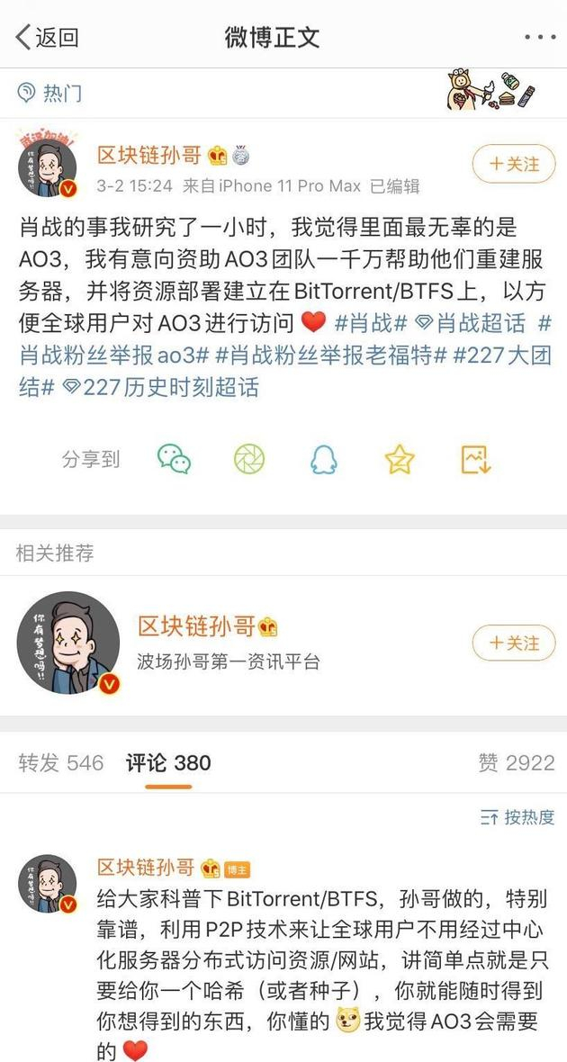 人称“圆梦大使”的孙宇晨也参与其中,宣称有意资助AO3 1000万元以重建服务器。对此,克劳迪娅·瑞贝莎告诉新浪科技,非常感谢中国用户社区的支持,然而现在服务器运转正常,即使有大笔资金注入,问题也并不是AO3可以解决的,所以恐怕不能接受这笔捐赠。