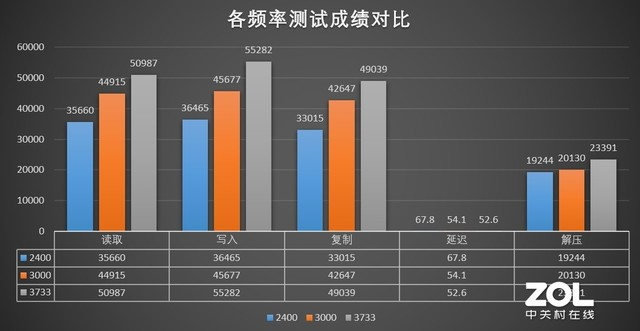我们首先采用2400MHz进行测试,然后再用3000MHz,最后开启XMP自动超频功能将内存超频到3733MHz进行对比,通过三组测试成绩对比来让大家更好的了解这款内存的性能表现。